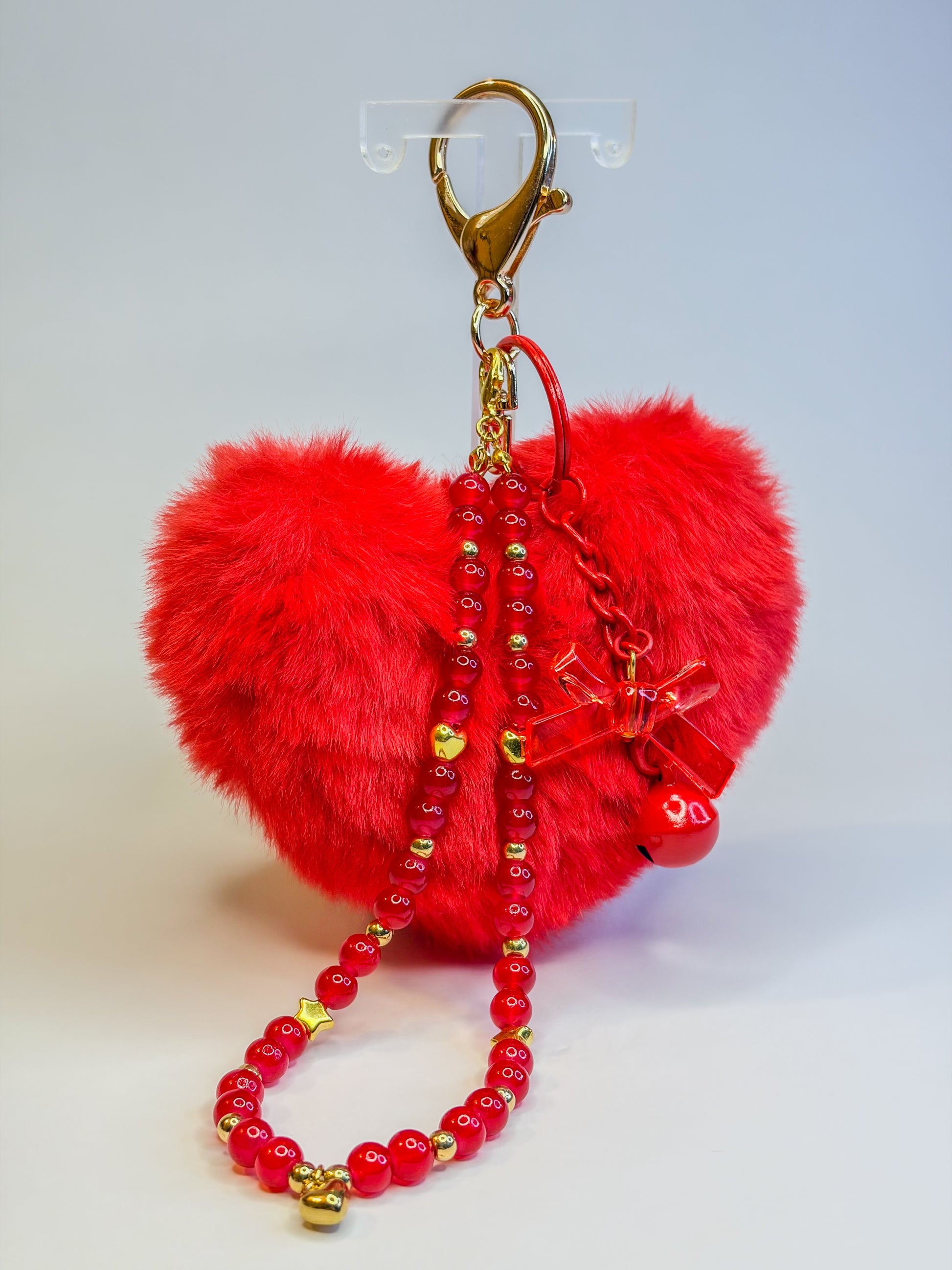 Ce bag charm met en valeur un magnifique cœur rouge en peluche toute douce, symbole d’amour, accompagné d’un nœud élégant et d’un grelot rouge et d’un bracelet de perles rouges, sublimé par des perles dorées en forme de cœur et d’étoile.